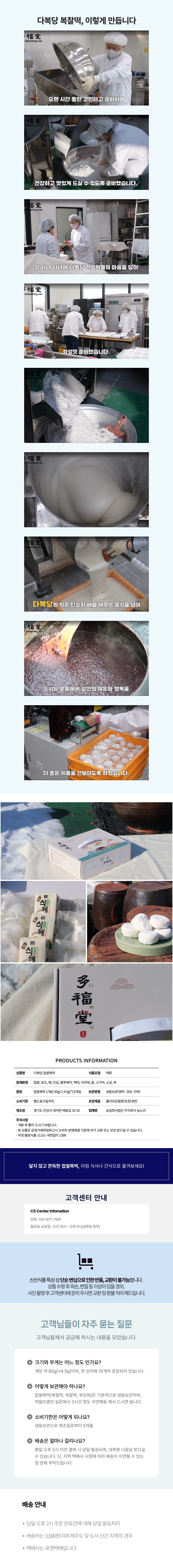 | 포장단위별 내용물의 용량(중량), 수량 | 찹쌀복떡 1개당 85g(±4.5g) * 15개 1박스 |