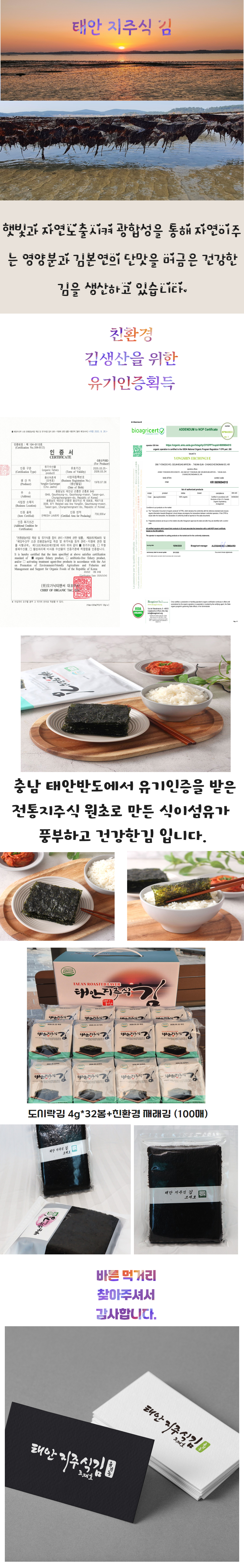 친환경 인증 태안지주식 김 2종세트 3호(재래김 100매+도시락김 32봉)