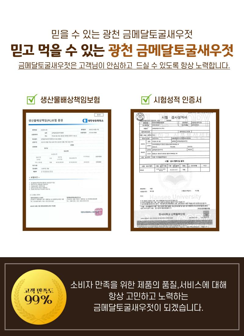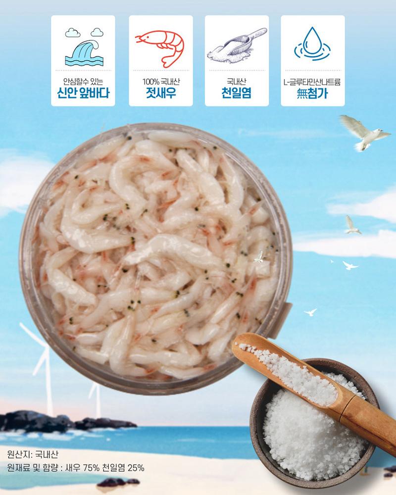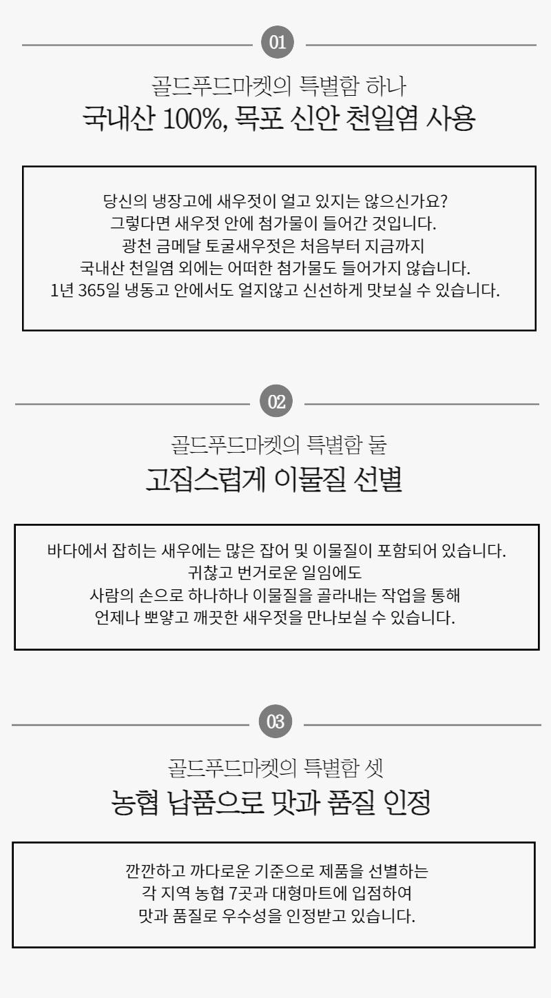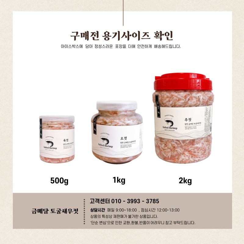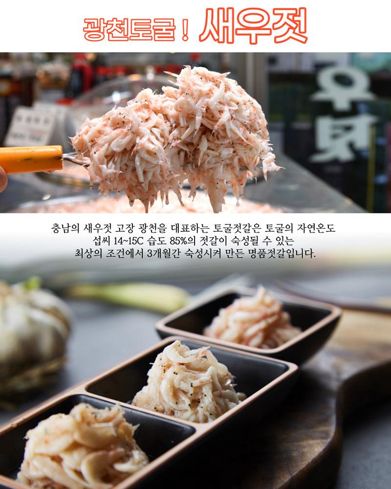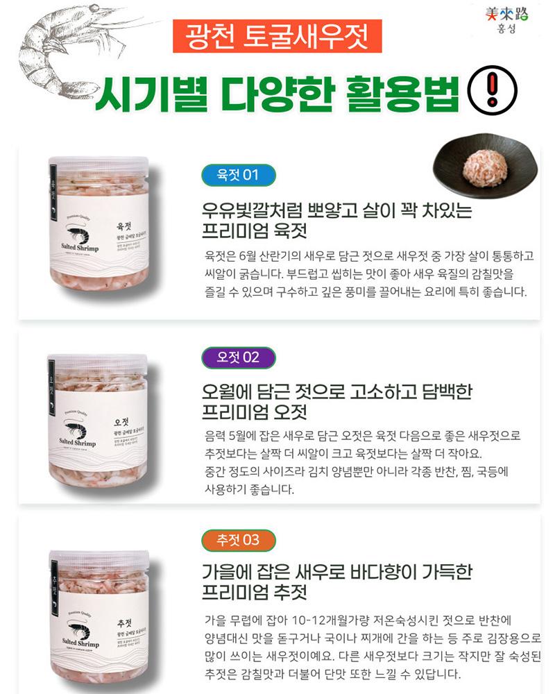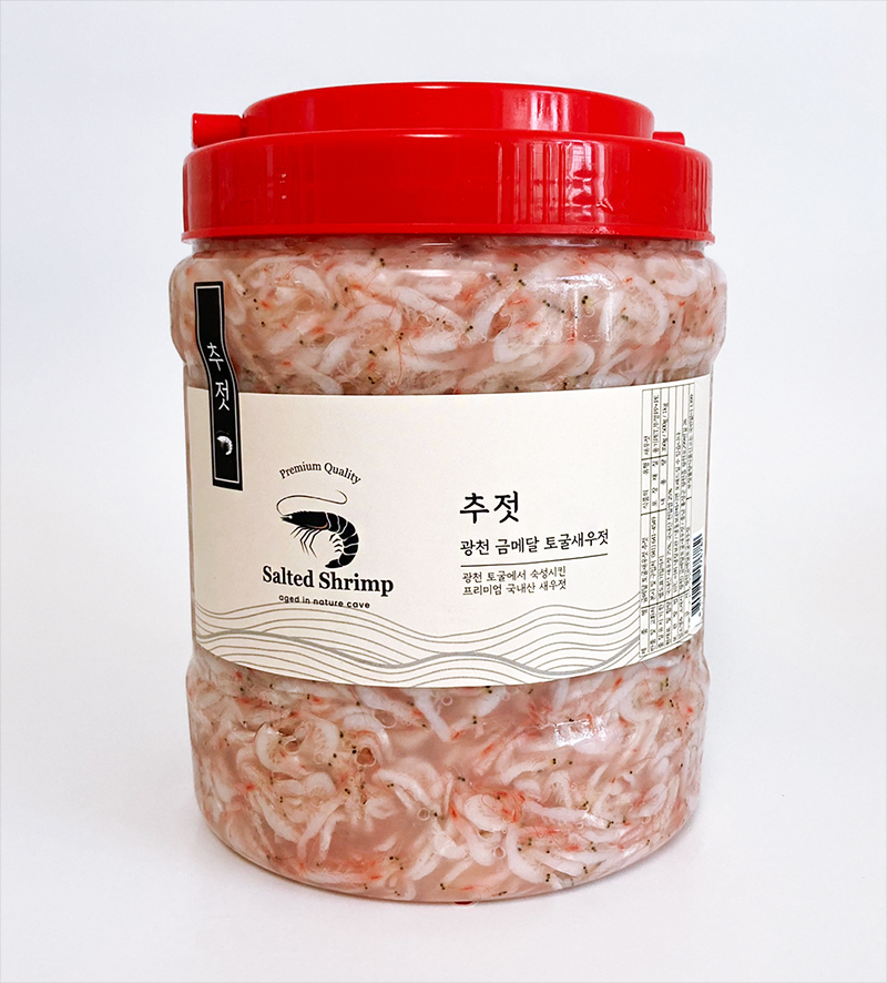 PREMIUM SALTED SHIRIMP 토굴에서 숙성한 프리미엄 추젓 추젓은 가을에 잡은 신선한 새우를 깨끗하게 손질하여 저온숙성시켜 만든 새우젓이예요.크기는 조금 작아도 오래 묵어 깊은 풍미가 있기에 주로 김장철에 사용합니다.광천 금메달 토굴새우젓은 토굴 새우젓의 원조 "충남 광천"에 위치하며1년 365일 일정한 온도를 유지하는 토굴에서 발효과 숙성을 거쳐 완성합니다.※원재료 및 함량 : 국내산 새우 75%, 국내산 천일염 25%