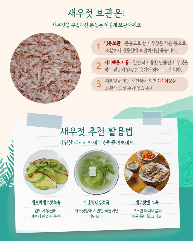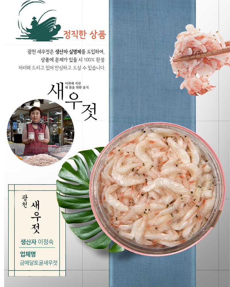PREMIUM SALTED SHIRIMP 토굴에서 숙성한 프리미엄 오젓 오젓은 5월에 잡은 새우로 담근 젓으로 육젓보다는 조금 작으나감칠맛은 가장 으뜸이라서 각종 찌개, 나물 등에 양념으로 많이 쓰여요.씹히는 맛이 육젓 못지 않게 뛰어나며 색이 뽀얗고 하얀것이 특징입니다.광천금메달토구새우젓은 토굴 새우젓의 원조 "충남 광천읍"에 위치하며1년 365일 일정한 온도를 유지하는 토굴에서 발효와 숙성을 거쳐 완성합니다.※원재료 및 함량 : 국내산 새우 75%, 국내산 천일염 25%