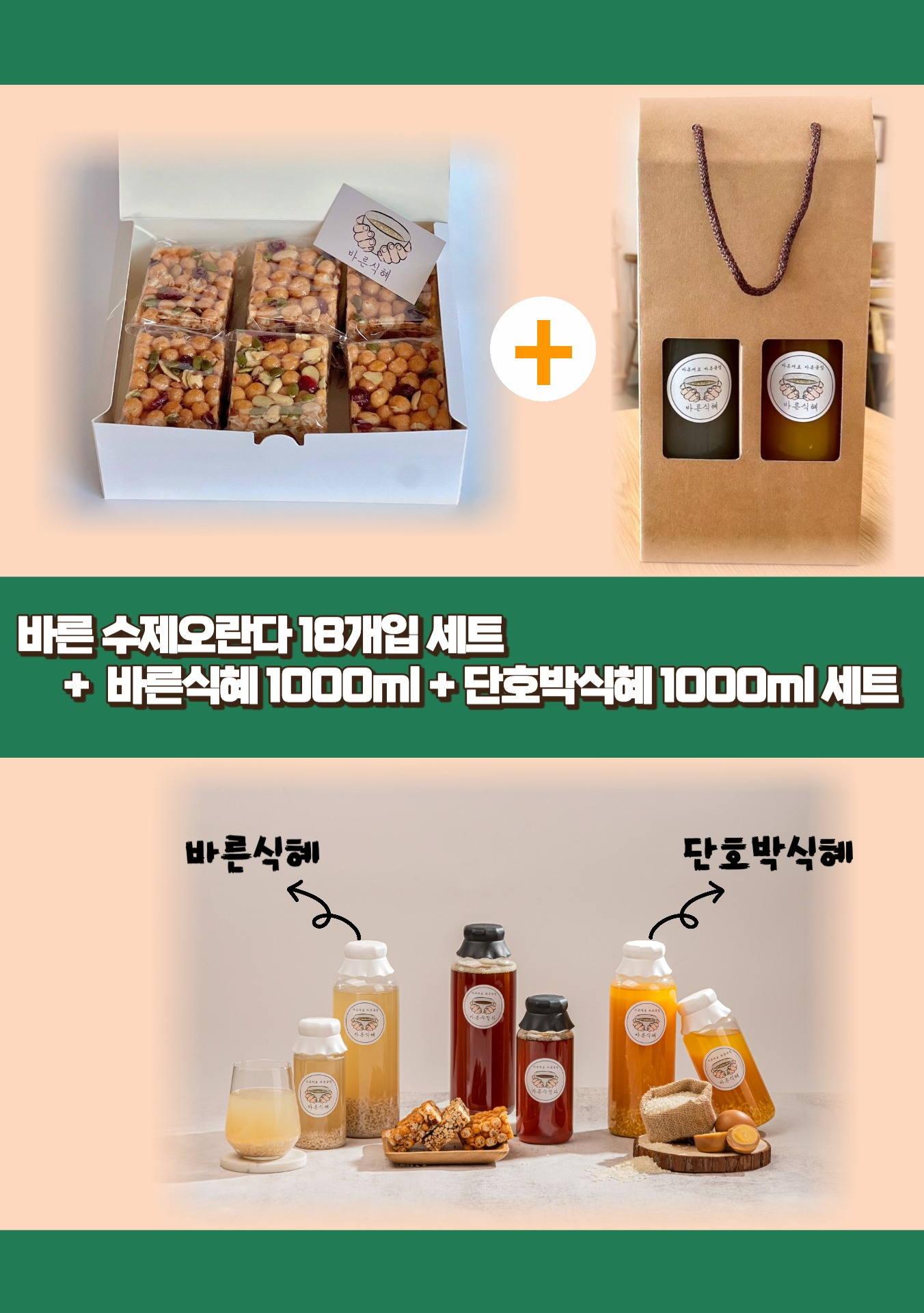 | 포장단위별 내용물의 용량(중량), 수량 | 바른 수제오란다 18ea + 바른식혜1000ml+ 단호박식혜1000ml |