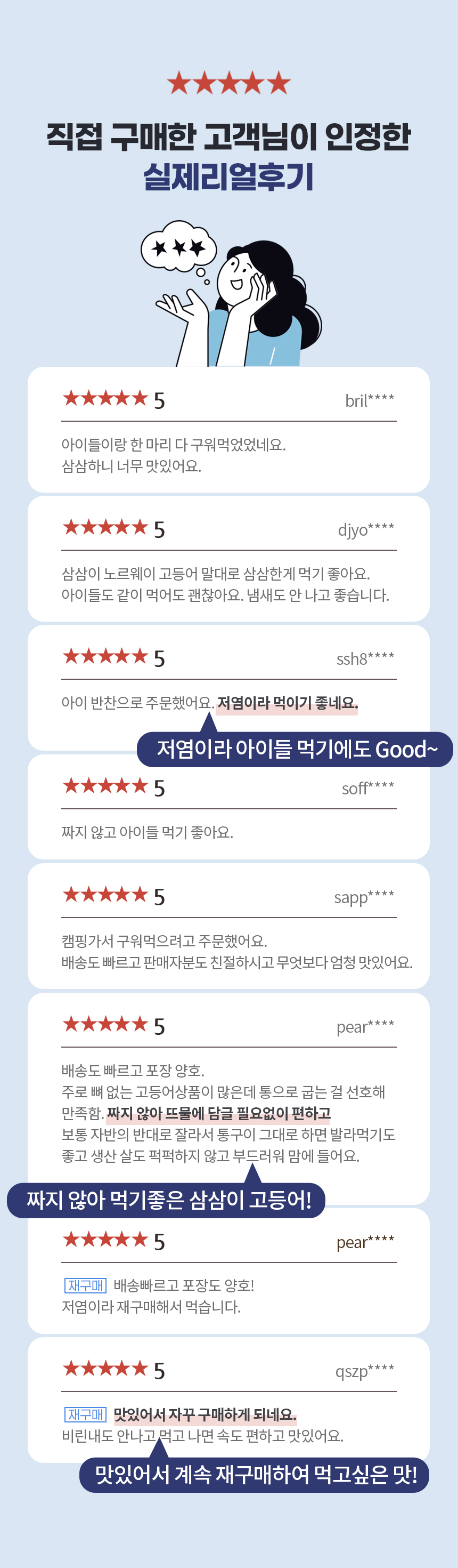 | 원산지 | 고등어-노르웨이산, 임연수-러시아,미국산, 삼치-국내산 |