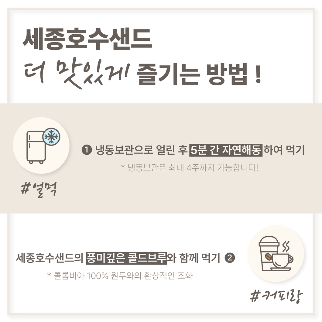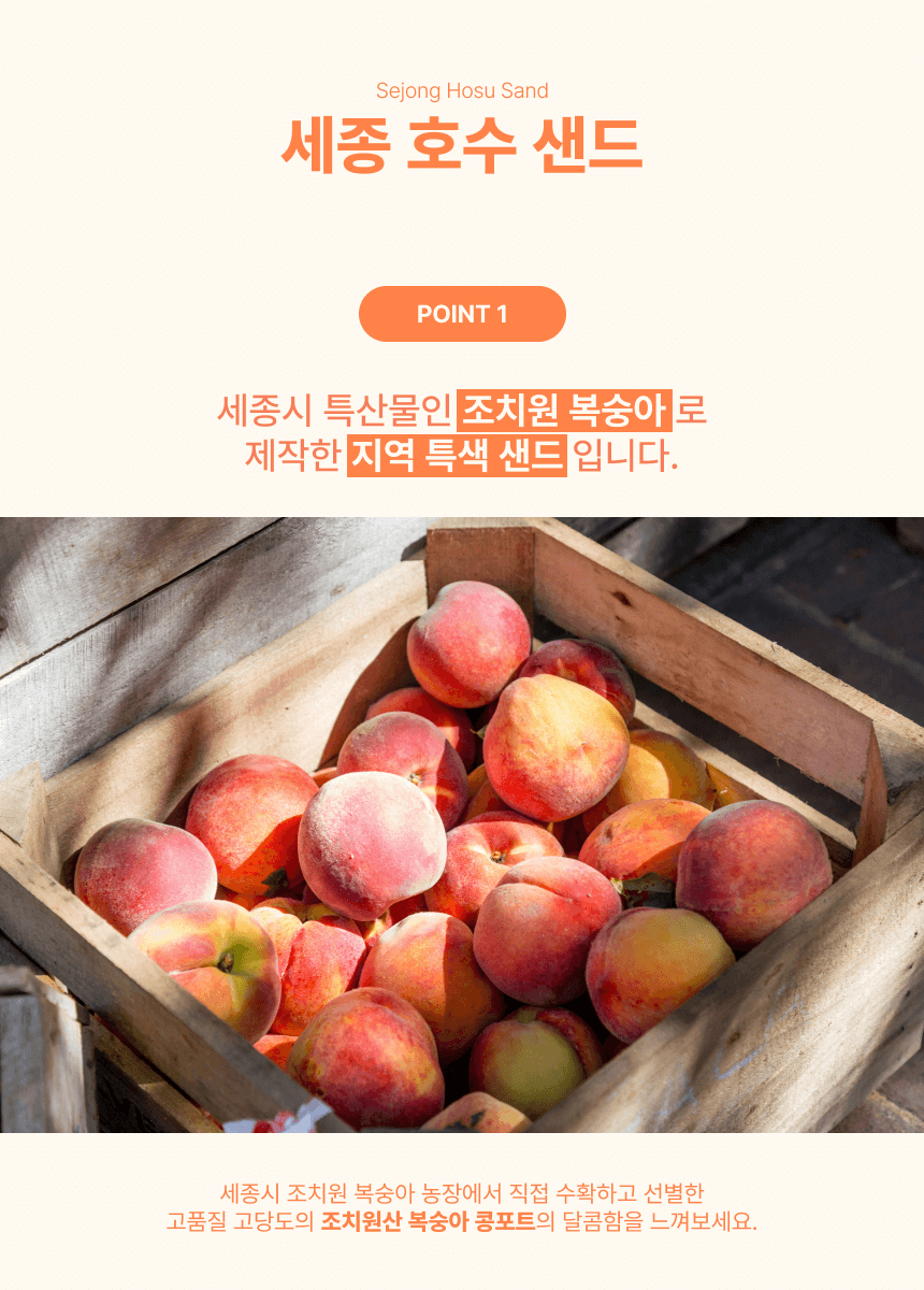 세종호수샌드는 매주 월,화,수,목오후 2시 전 주문건에 한 해순차적으로 당일출고됩니다.이 점 참고하여 주문 해주시길 바랍니다. 세종호수샌드의 시그니쳐 복숭아 샌드 선택 옵션으로 아래 두가지 맛 중 선택 부탁 드립니다 ^^ 여기에 추가로 세종호수샌드에서 주문 제작한 이쁜 다회용 보냉백으로 포장해 드립니다 ^^