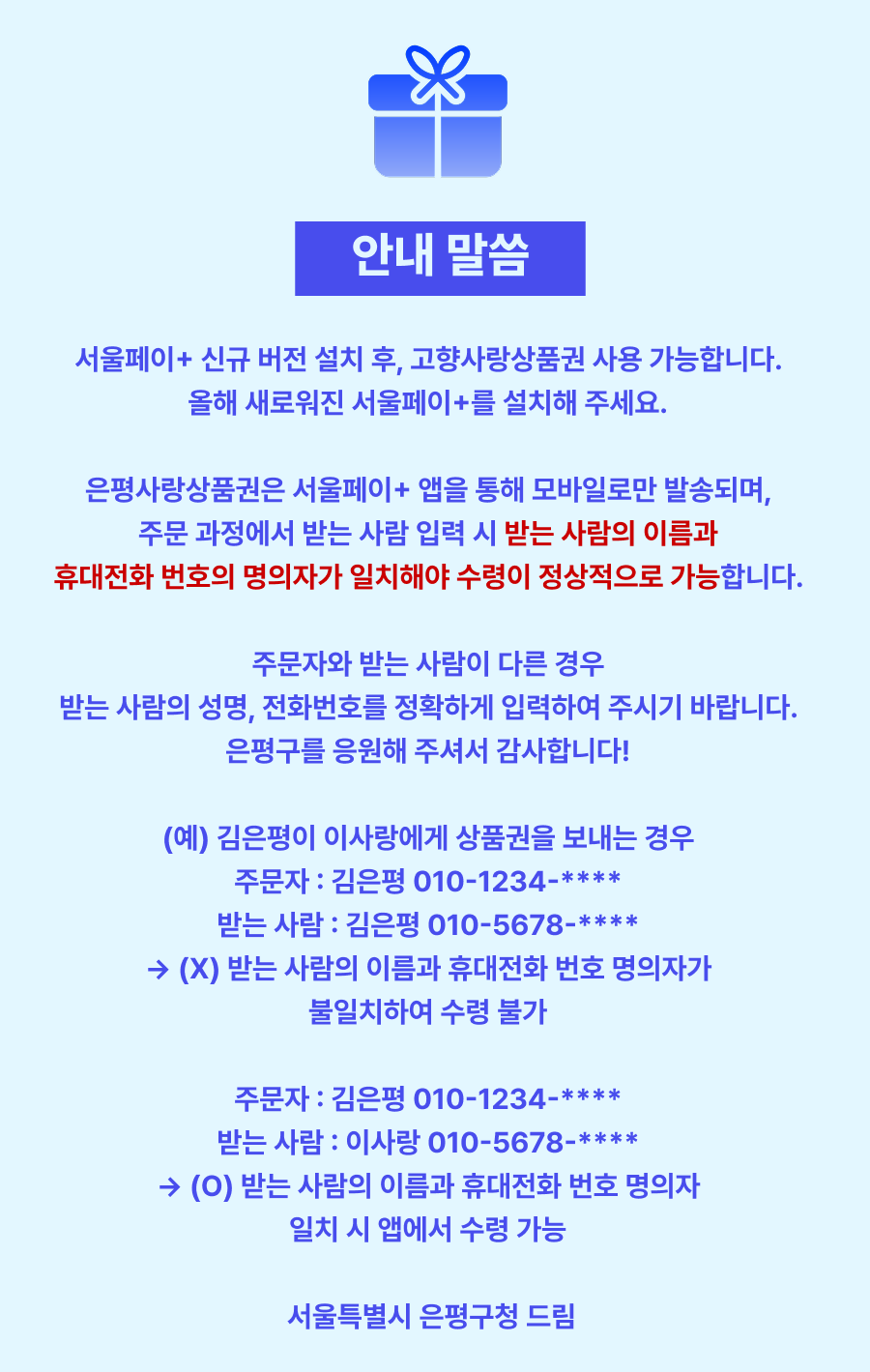 | 이용 가능 매장 | 은평구 내 은평사랑상품권(서울페이+) 가맹점 |