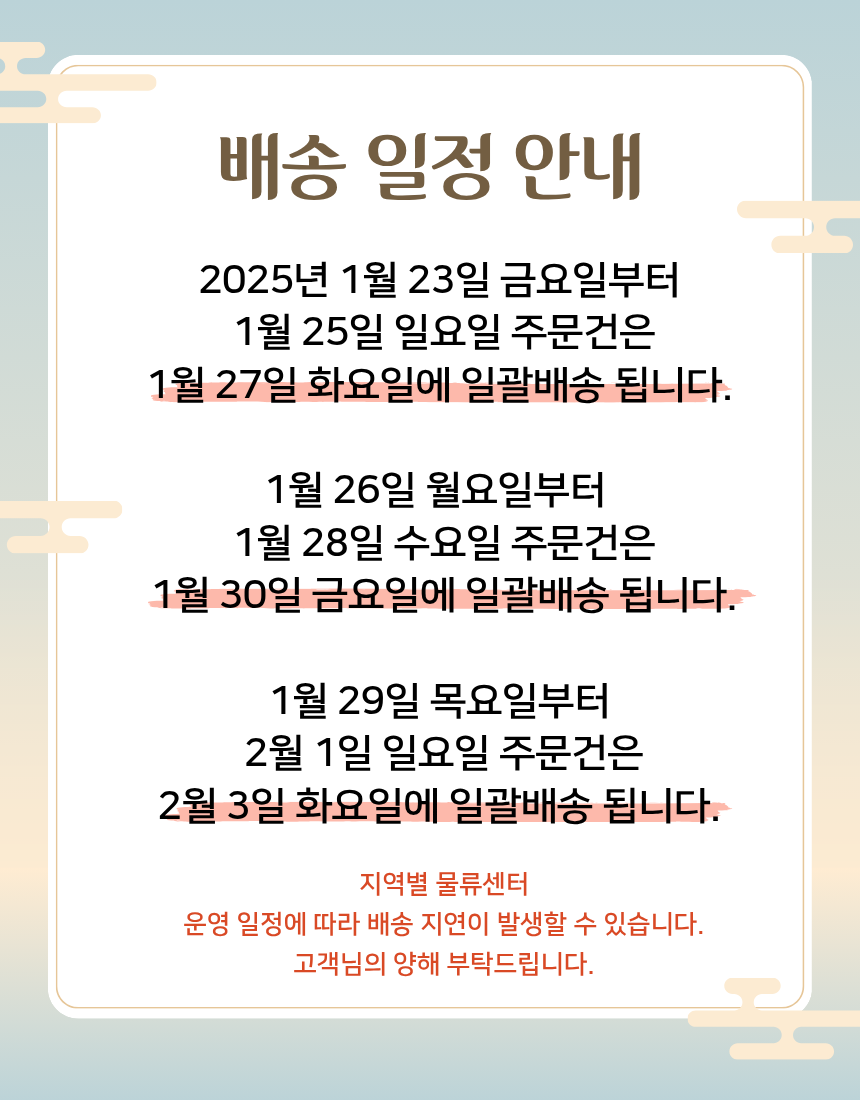 • 하절기(6월~8월)는 아이스박스 + 아이스팩(중형)1개가 구성되어 나갑니다.