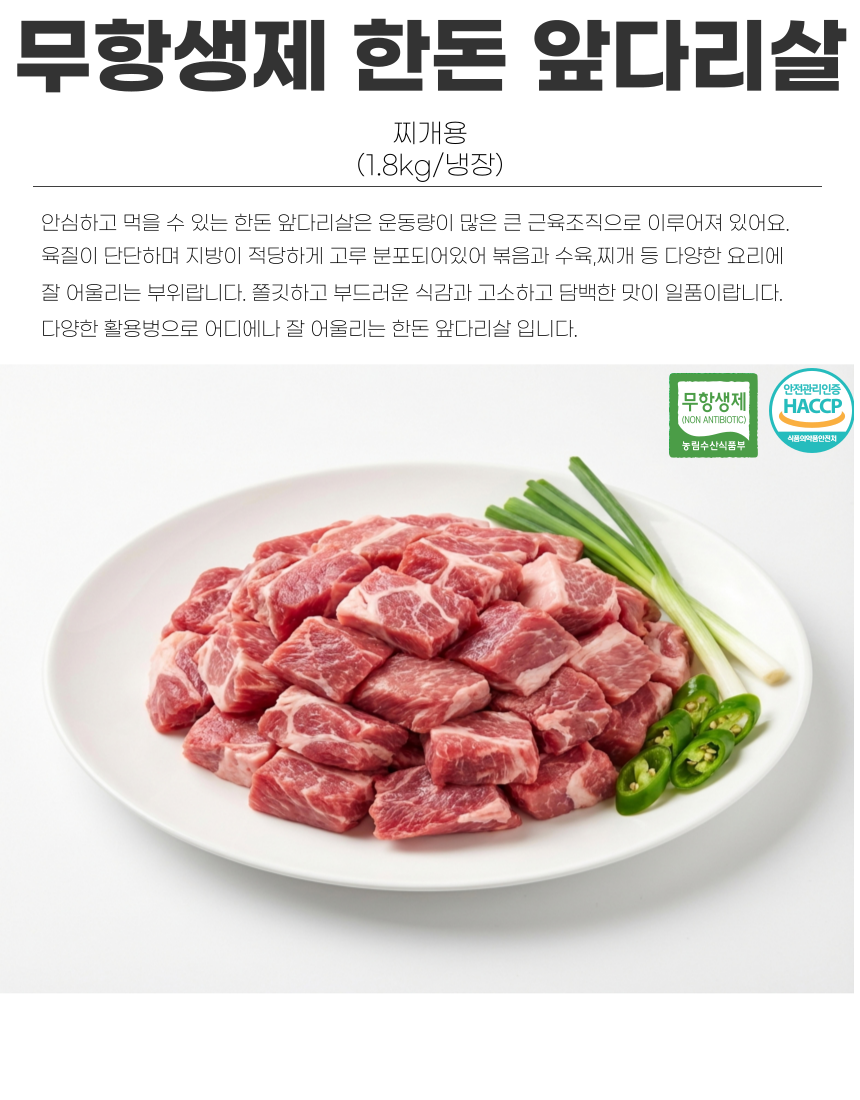 | 상품구성 | 무항생제 앞다리살 찌개용 1.8kg /아이스팩/아이스박스 |