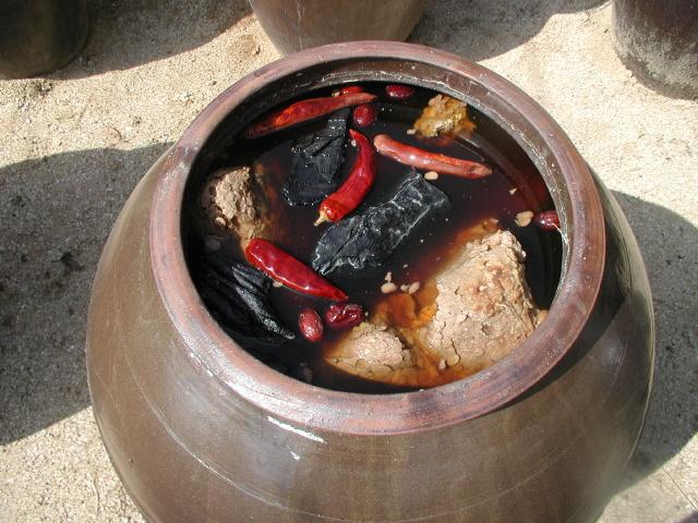 1. 잘 띄운 메주와 천일염이 장독 안에서 50일 동안 미생물 발효가 일어나면 연갈색의 간장물이 만들어 집니다.
