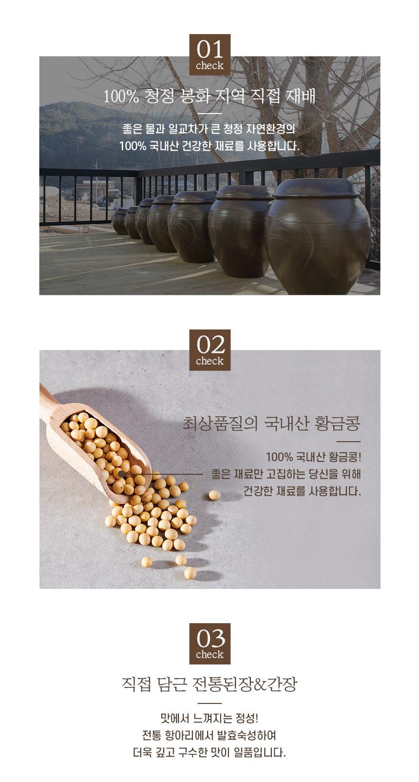 우리된장은 지역 주민들이 재배한 황금콩만을 사용하고, 좋은 물과 일교차가 큰 청정 자연환경에서 저온. 장기간 익어가는 것과 더불어