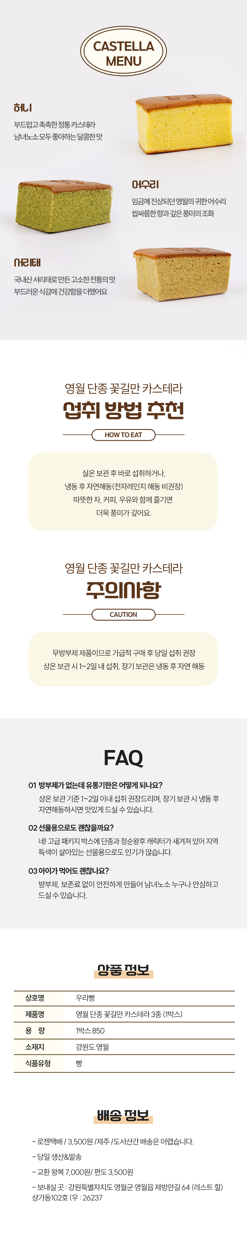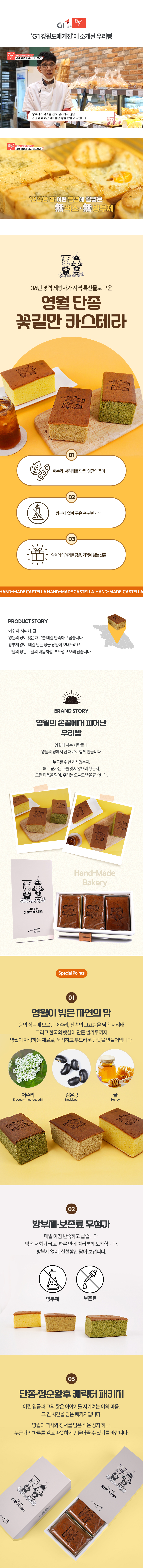 | 원재료명 및 함량 | 계란(국내산) 설탕(국내산) 강력분밀가루(호주,캐나다) 버터(프랑스) 어수리(영월산) 꿀(영월) 서리태(영월) |