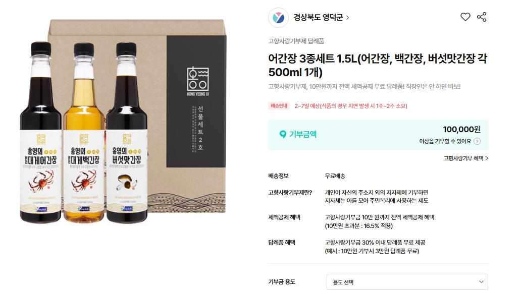 바로 이 답례품으로, 영덕의 프리미엄 어간장, '어간장 3종세트 1.5L(어간장, 백간장, 버섯맛간장 각 500ml 1개)' 을 받을 수 있는 것이죠.