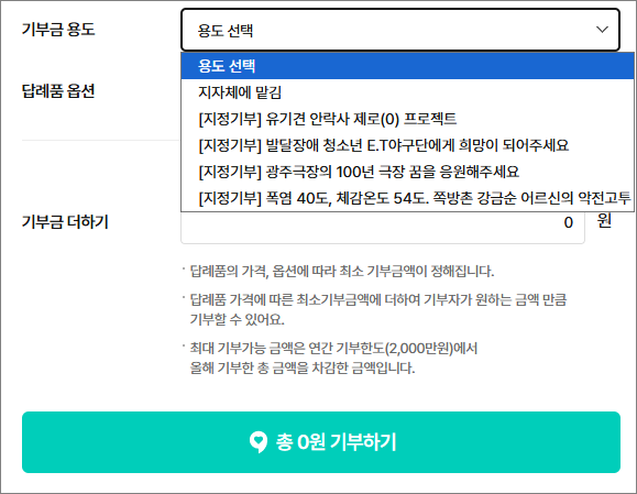 먼저 지정기부 카테고리를 살펴봤는데 다양한 지자체와 사업들이 눈에 들어옴.