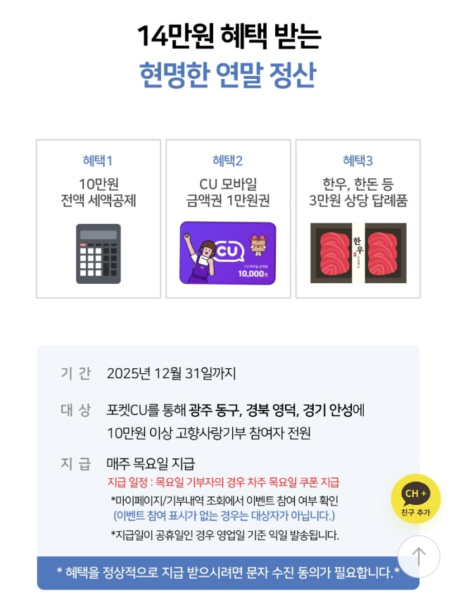 이를 활용하려면 포켓 CU 앱에서 고향사랑기부제 배너를 클릭해 위기브로 이동한 후 기부하면 됨.