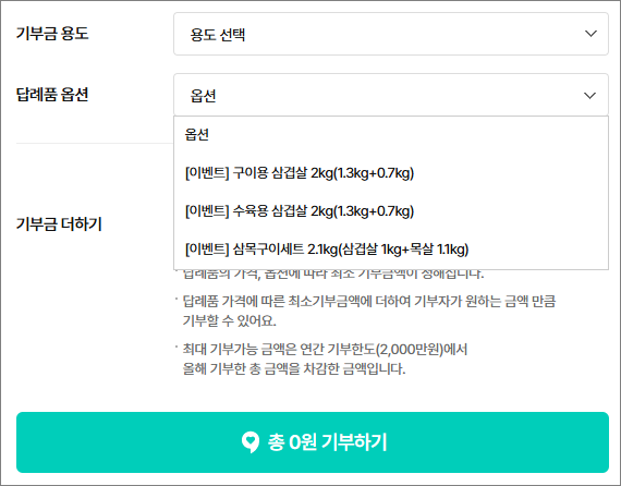 답례품은 한돈 국내산 구이용 삼겹살 2kg 선택함.