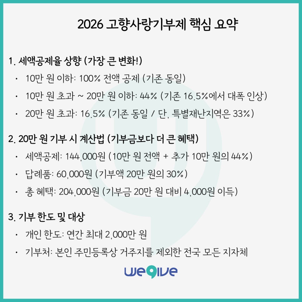 4️⃣ 2026년 개편으로 세액공제 확대와 기부 한도 상향이 이루어져, 연대를 보다 현식적으로 지속할 수 있다.