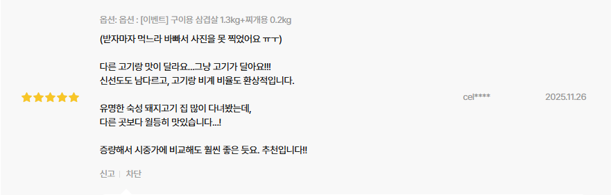 그래서인지 단순히 ‘고기 한 팩’이 아니라, 구이용 + 찌개용, 수육용 등으로 다양하게 먹을 수 있는 실용적인 구성이라는 평가가 이어집니다.