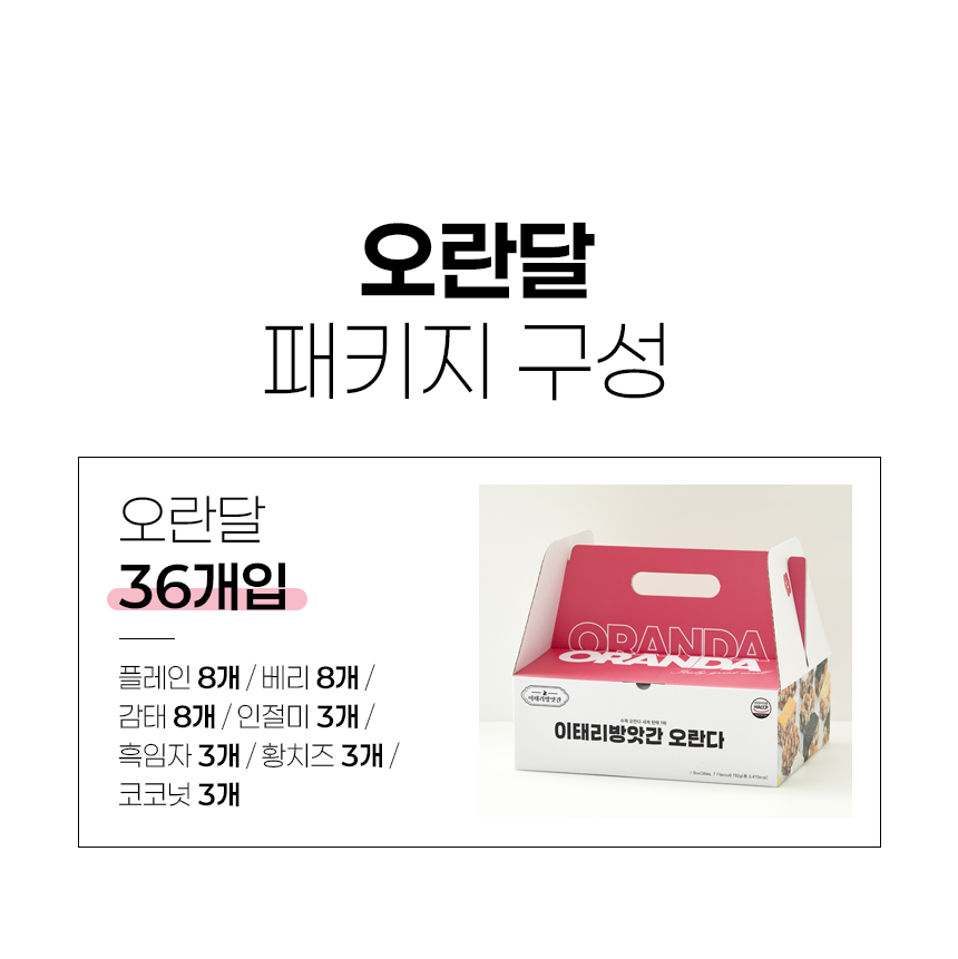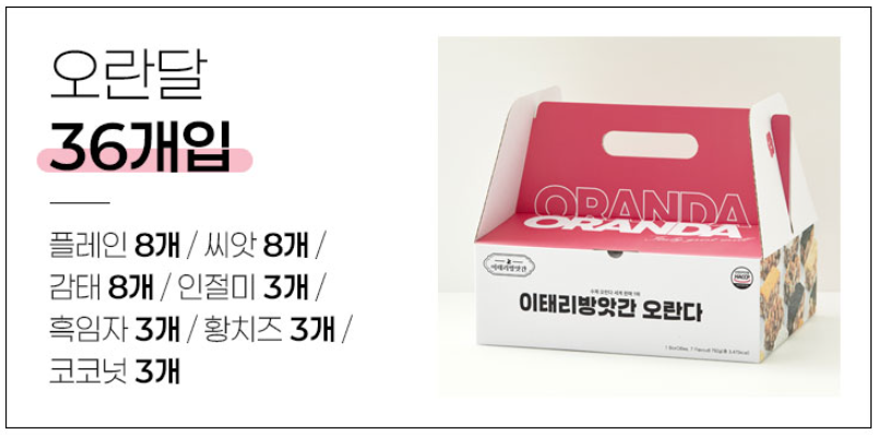 | 포장단위별 내용물의 용량(중량), 수량 | 평균 20g/총 36개(7가지 종류 혼합 구성) |