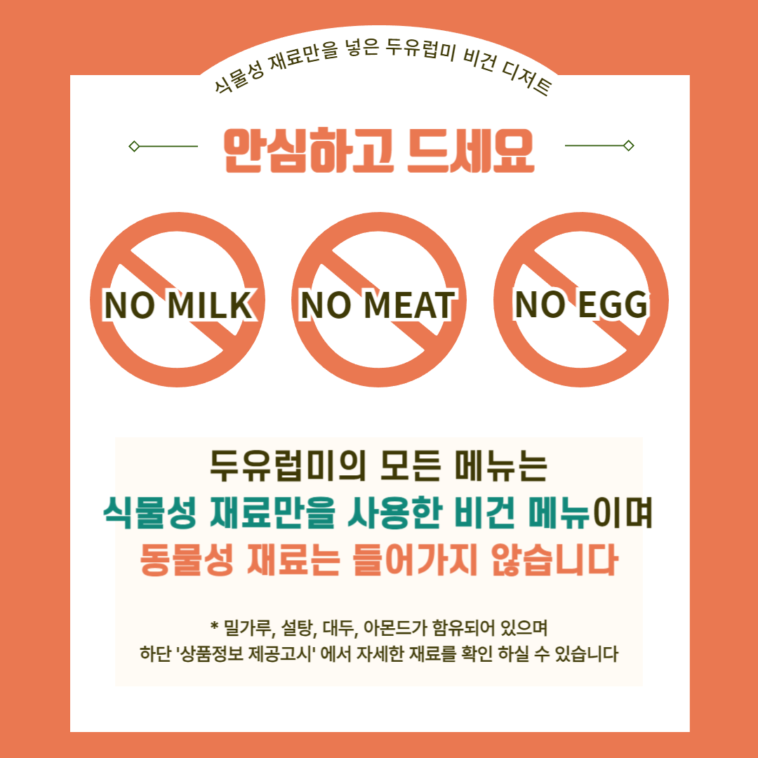 | 원재료명 (「농수산물의 원산지 표시 등에 관한 법률」에 따른 원산지 표시 포함) 및 함량(원재료 함량 표시대상 식품에 한함) | 밀가루(미국산), 아몬드분말(미국산), 수제두유(국내산콩), 해바라기씨유(이탈리아산), 라즈베리잼(외국산), 바닐라에센스(외국산), 토마토케첩(외국산), 멜론레진(외국산), 식용색소(외국산), 코코아분말(인도네시아산), 설탕(국산), 소금(국내산), 옥수수전분(외국산) |