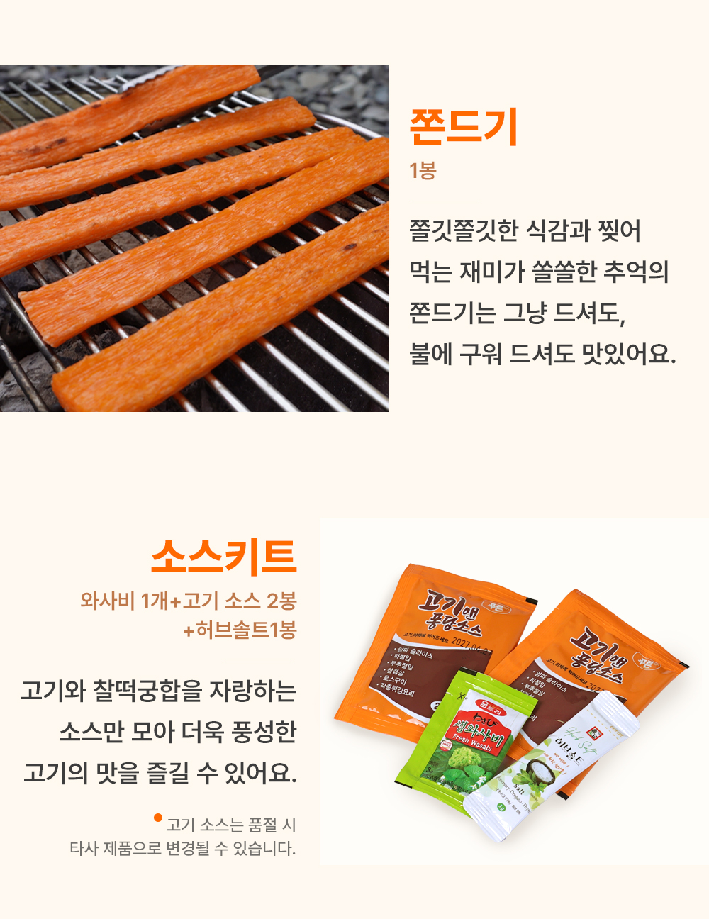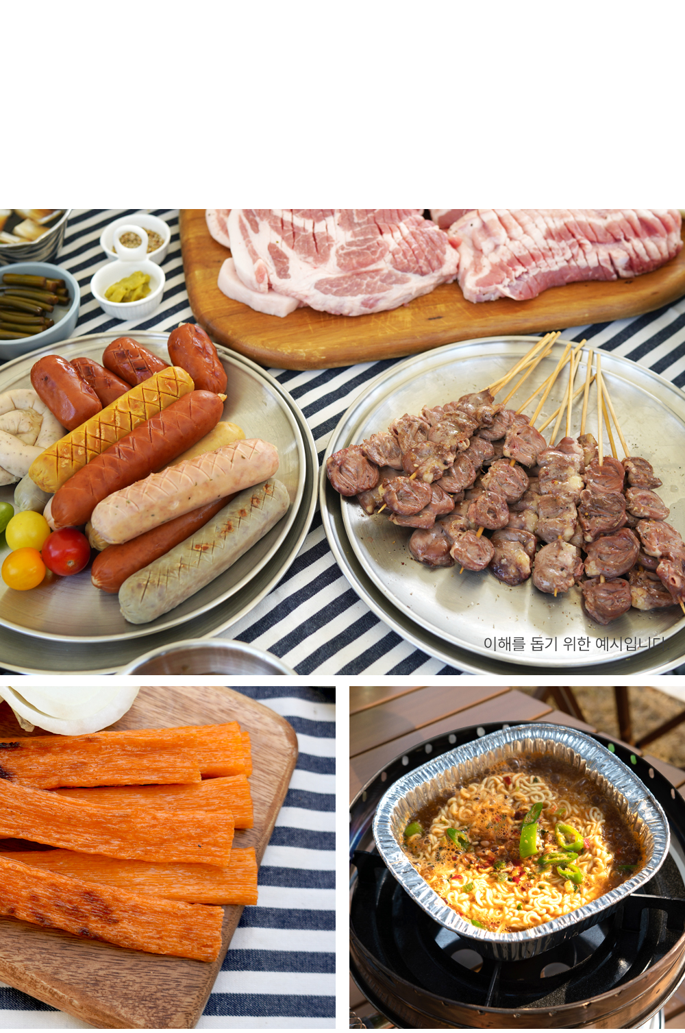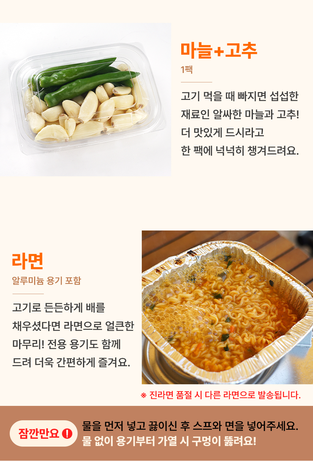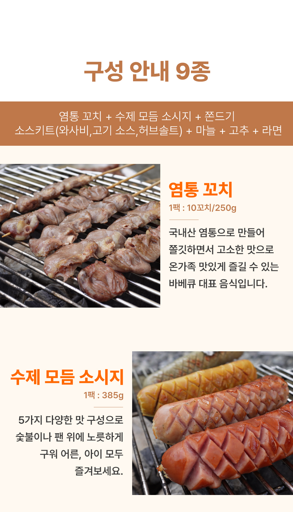 | 상품구성 | 한돈 삼겹살300g+한돈 목살300g+9종 구성품(염통꼬지1팩(10개), 수제모듬소시지, 쫀드기, 마늘, 고추, 라면, 소스키트(와사비,허브솔트,고기소스)) |