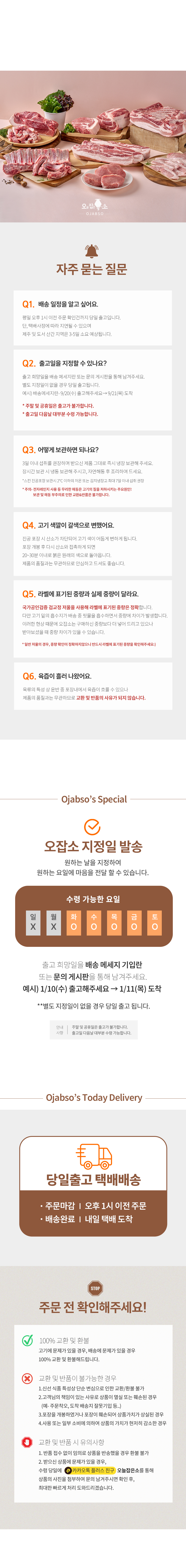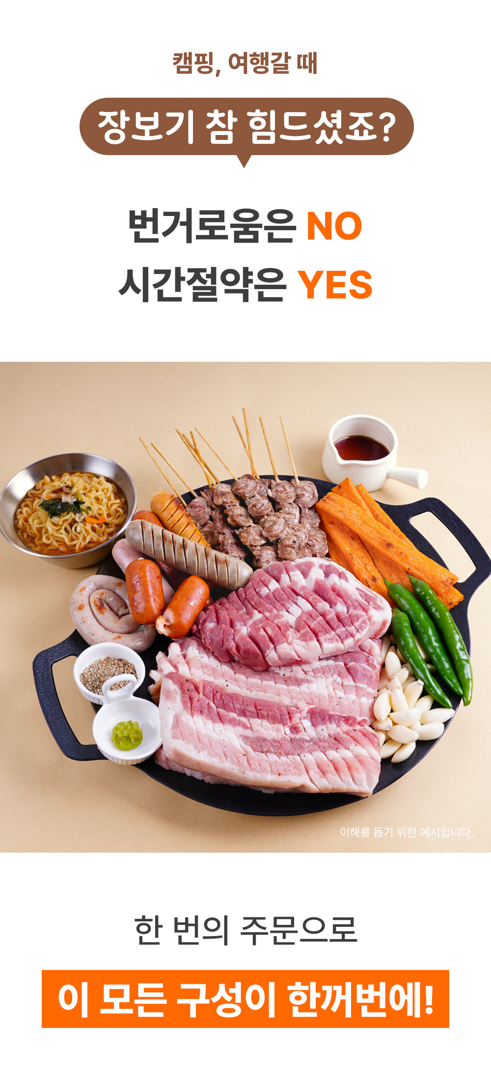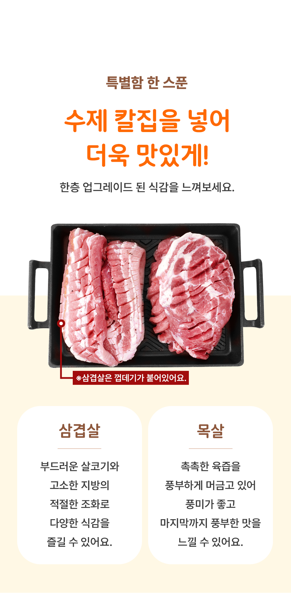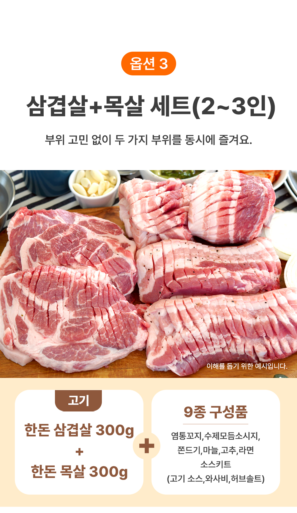 | 상품구성 | 한돈 삼겹살300g+한돈 목살300g+9종 구성품(염통꼬지1팩(10개), 수제모듬소시지, 쫀드기, 마늘, 고추, 라면, 소스키트(와사비,허브솔트,고기소스)) |