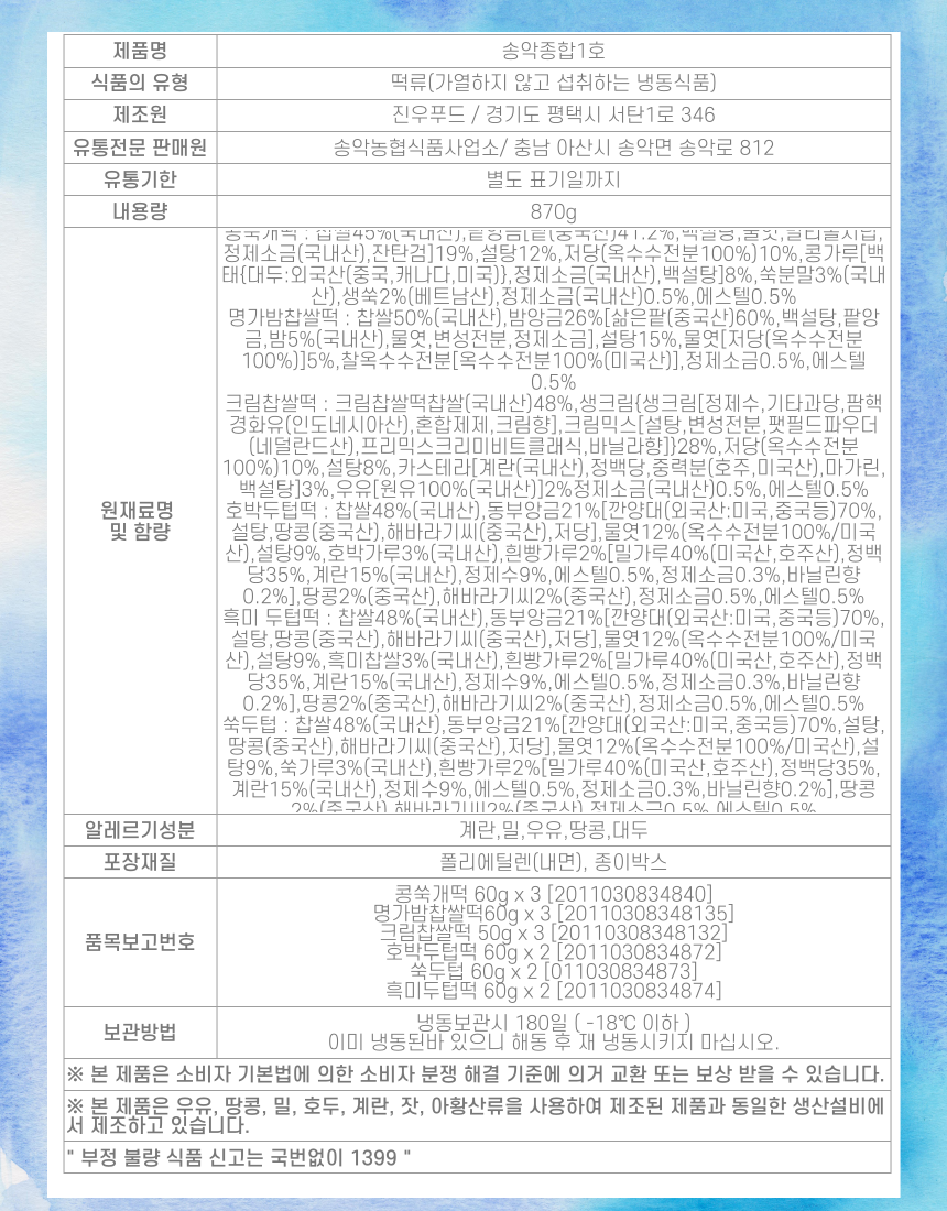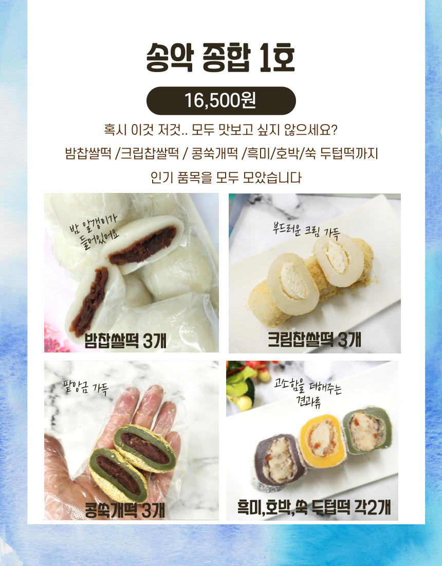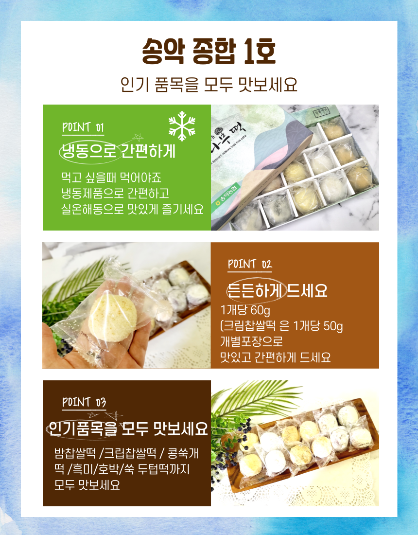 송악농협 냉동떡 1호 900g(콩쑥개떡, 밤, 크림 찹쌀떡, 호박, 쑥, 흑미 두텁떡)