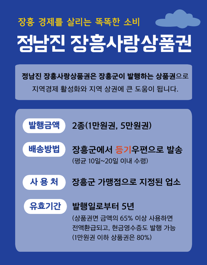 *☞ 가맹점 확인(1,386개소) : https://www.jangheung.go.kr/www/regional_economy/gift_certificate/franchise *