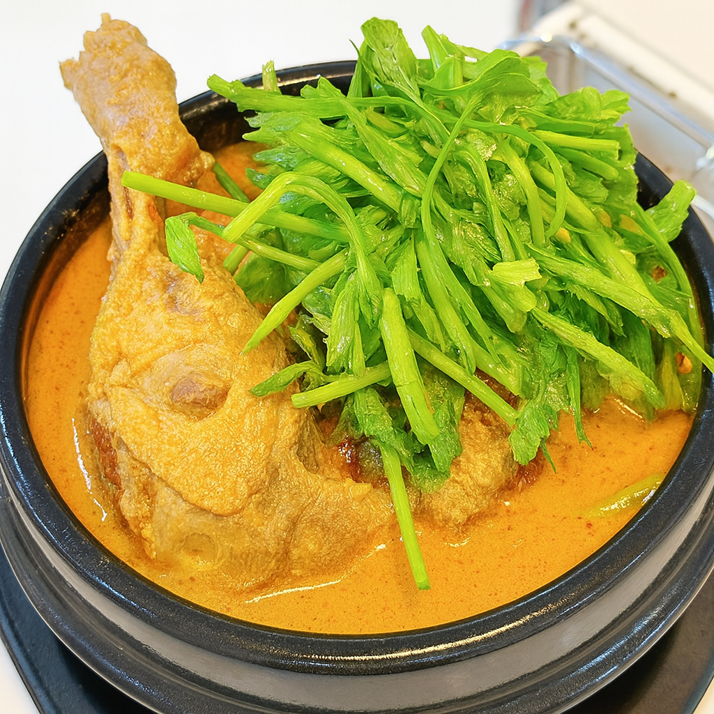 그리고 미나리가 빠질 수 없죠. 펄펄 끓는 국물에 살짝 데친 미나리를 초고추장 양념장에 콕 찍어 먹는 순간— 아삭한 식감과 새콤한 맛이 오리고기와 완벽한 조화를 이룹니다.