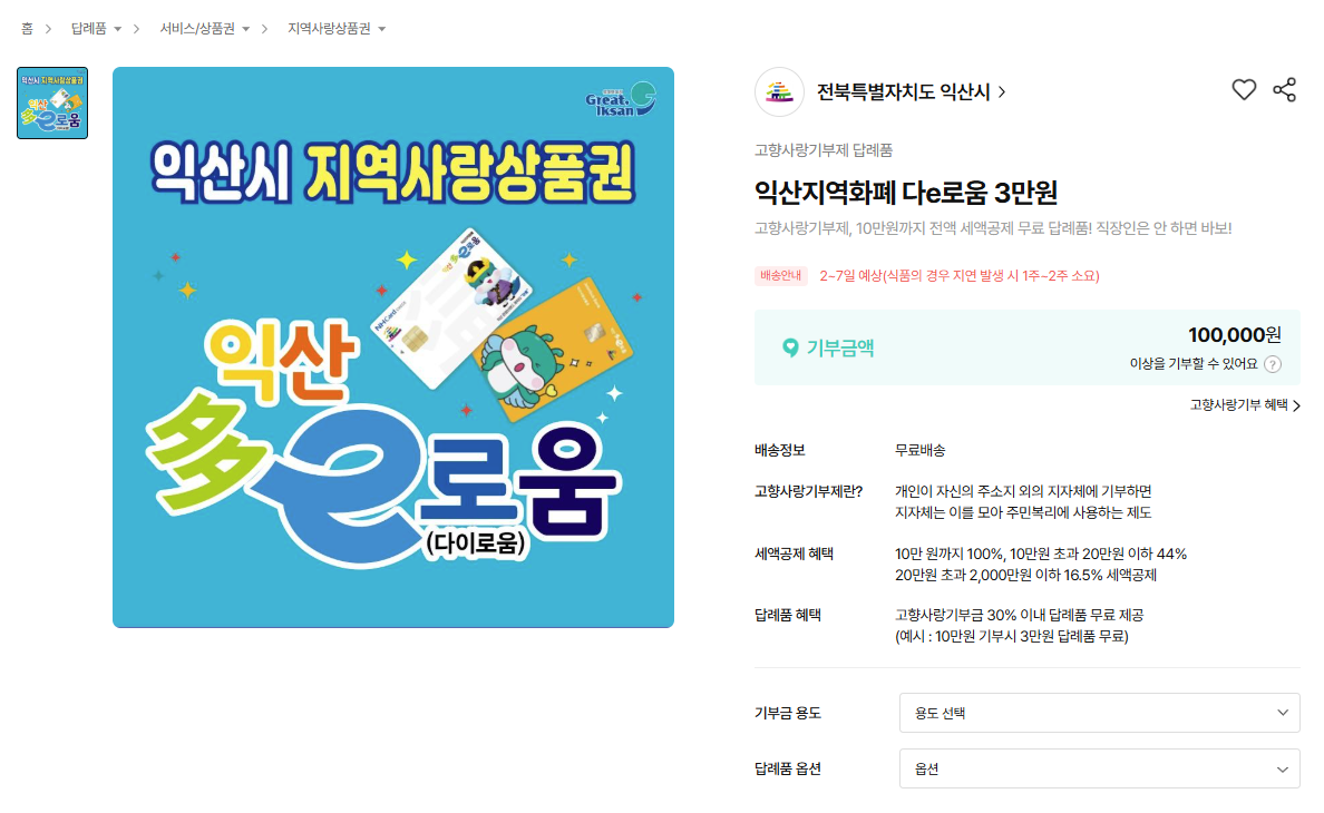 3️⃣ 익산에 고향사랑기부제를 하면 세액공제 혜택을 받을 수 있고, 답례품으로 익산 지역사랑상품권인 ‘다e로움’도 선택할 수 있습니다.