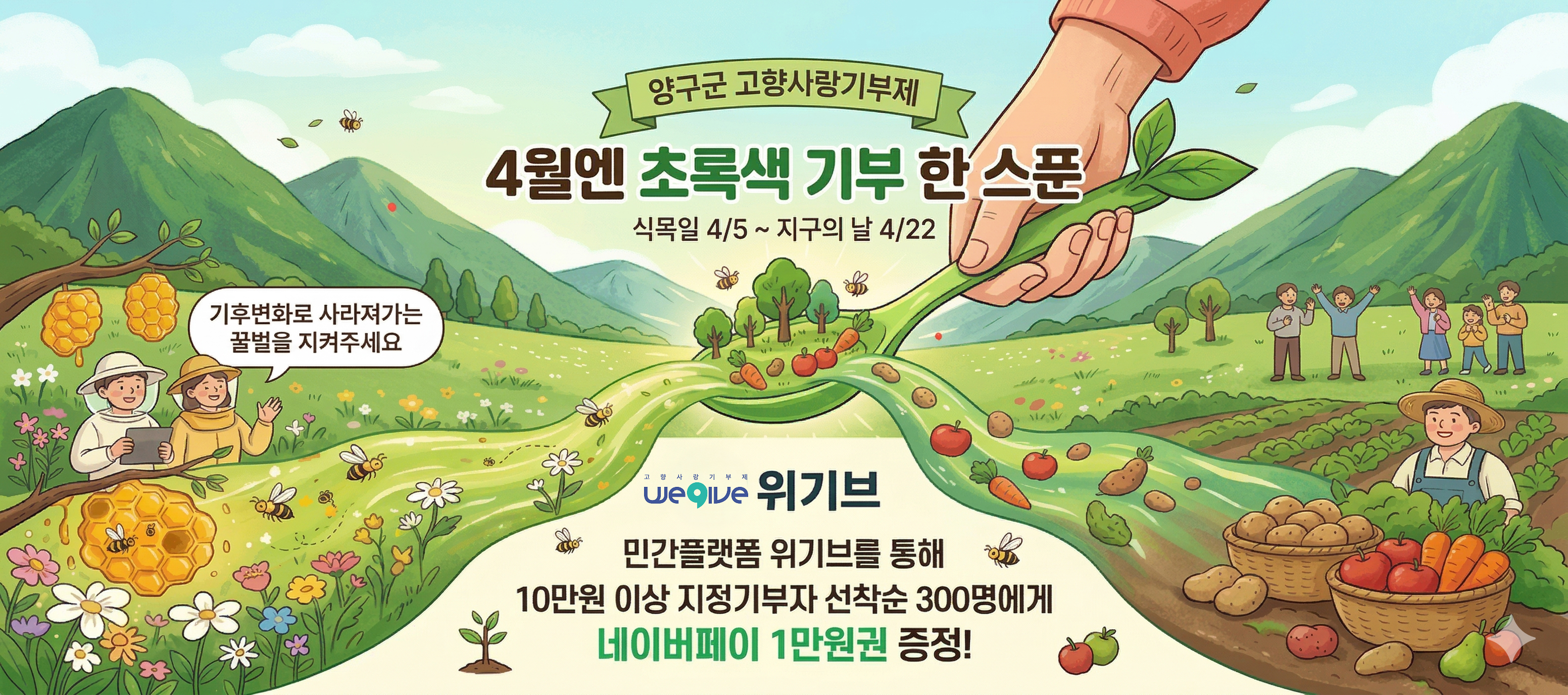 1️⃣ 양구군은 2026년 4월 5일부터 4월 22일까지 위기브에서 ‘4월엔 초록색 기부 한스푼’ 이벤트를 진행하며, 양구군에 10만 원 이상 기부한 사람 중 선착순 300명에게 네이버페이 1만 포인트를 제공합니다.