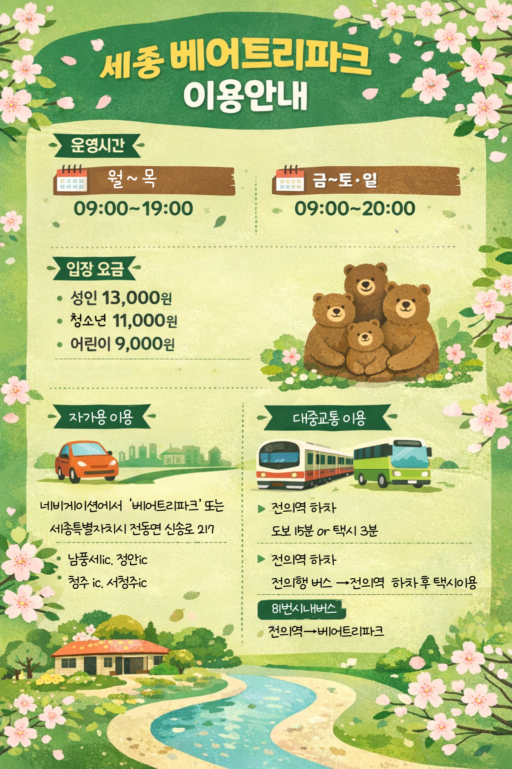 이번 봄에는 너무 붐비는 곳 대신, 세종에서 조금 더 여유로운 하루를 보내고 싶을 때 베어트리파크를 떠올려보셔도 좋겠습니다.